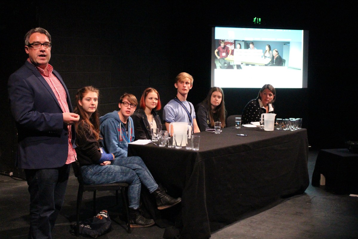 Alan King introduces the Young Critics 206 with panelists Meabh, Jack, Ciara, Colm and Emily. Chaired by Dr. Karen Fricker. Photo Credit: Rhona Dunnett